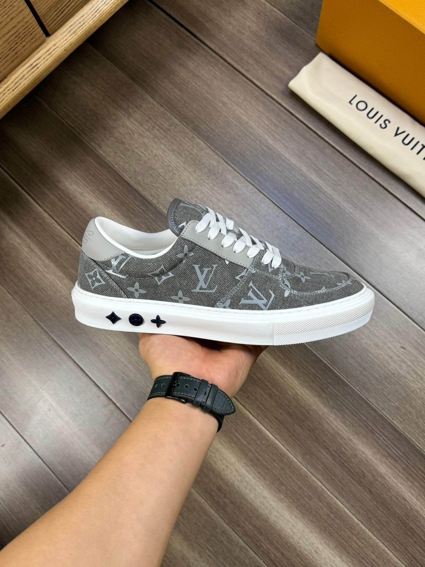 LV TRAINER SNEAKER IN GREY PASTEL MONOGRAM DENIM