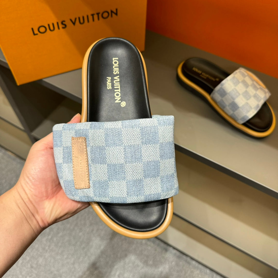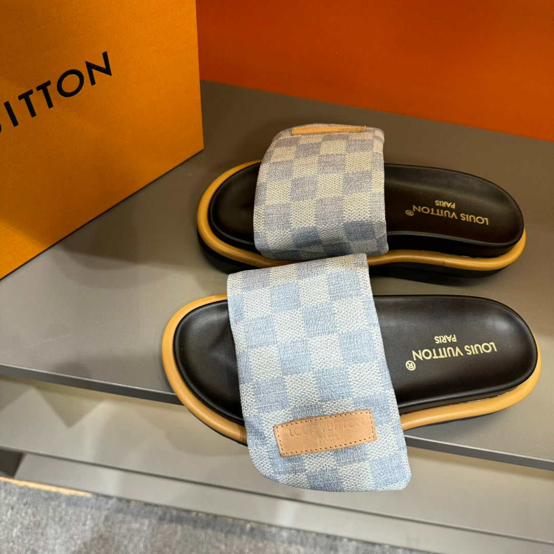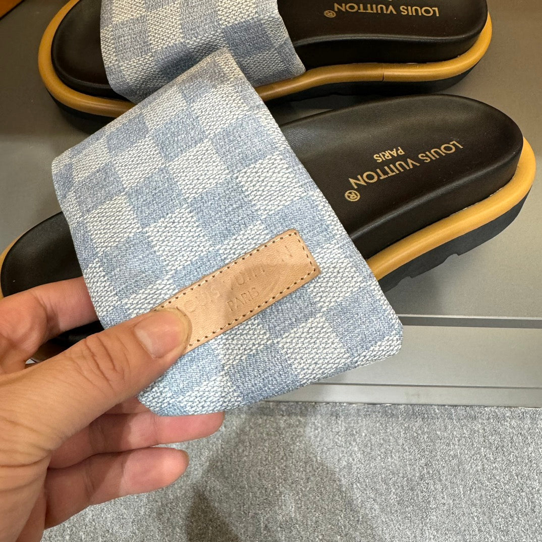 LV VELCRO SLIPPERS LIGHT BLUE DAMIER MONOGRAM JACQUARD