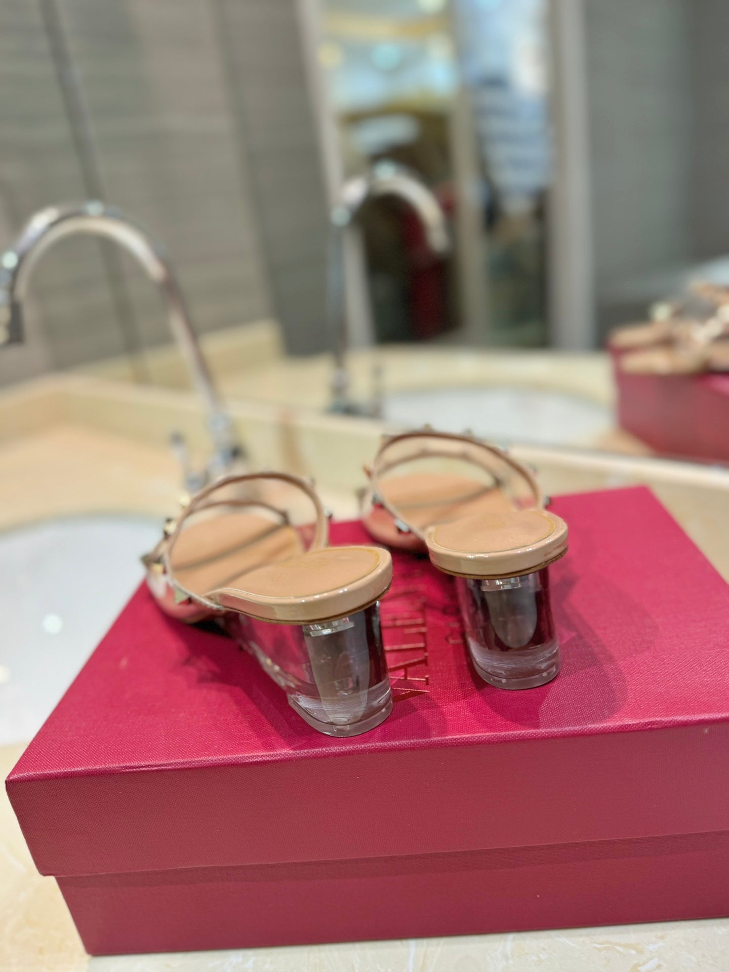ROCKSTUD MULE SANDALS IN CAMEL BROWN CALFSKIN AND TRANSPARENT PVC FILM