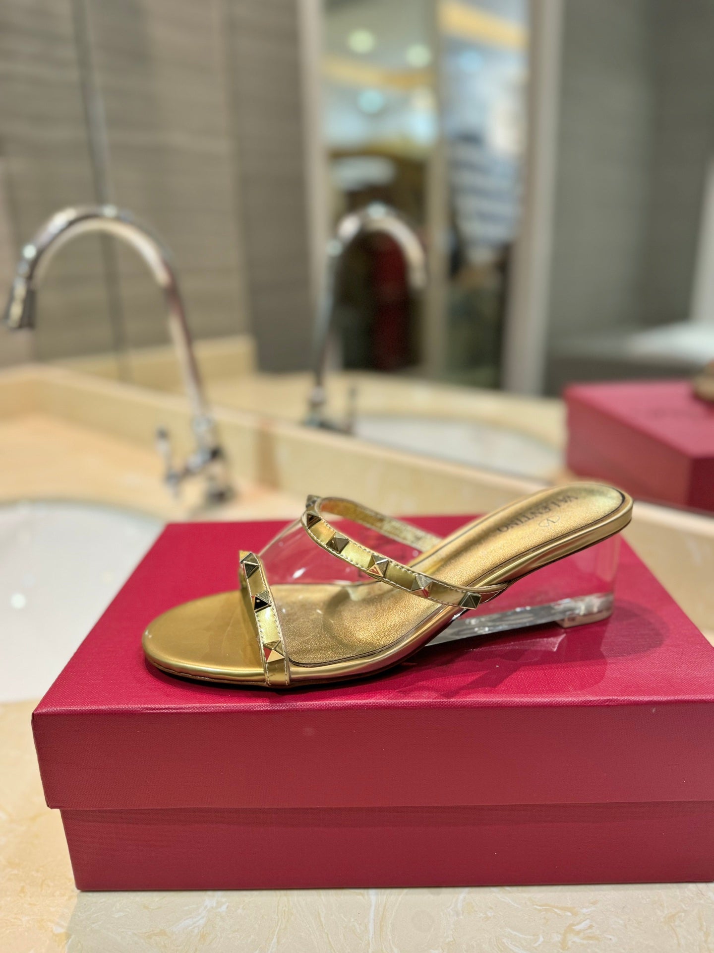 ROCKSTUD MULE SANDALS IN GOLD CALFSKIN AND TRANSPARENT PVC FILM