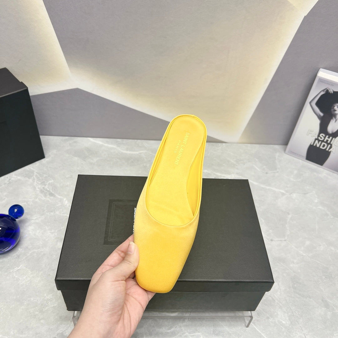 SL SQUARE TOE FLAT MULES LEMON SATIN