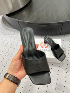 SQUARE-TOE MULES MEDIUM HEEL IN BLACK CALFSKIN LOGO EMBOSSED