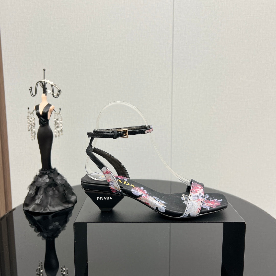 PRA TRIANGLE HEEL FLOWER MOTIF SATIN SANDALS BLACK
