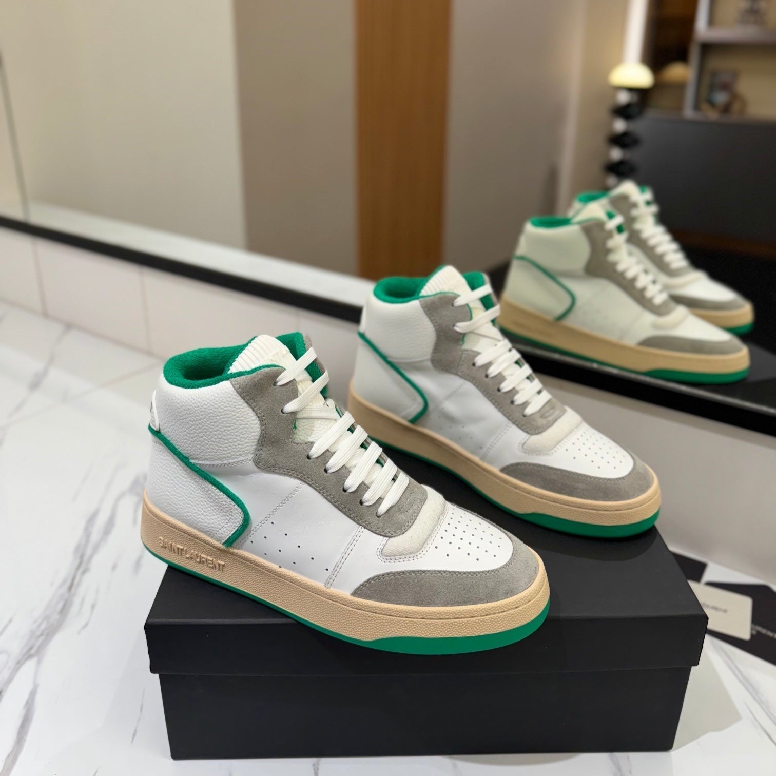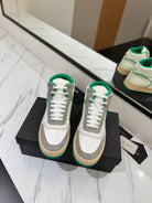 MID-TOP SNEAKERS IN WHITE PERFORATED LAMBSKIN AND GRAY SUEDE