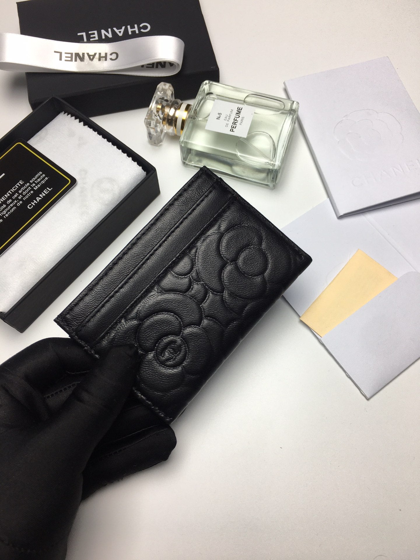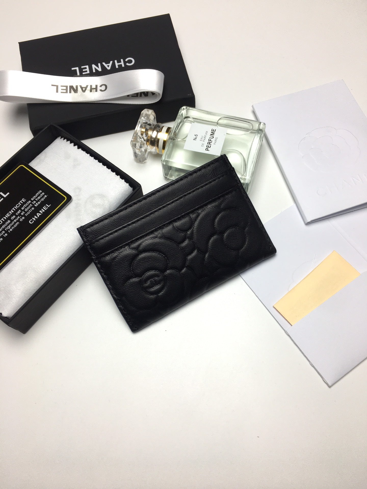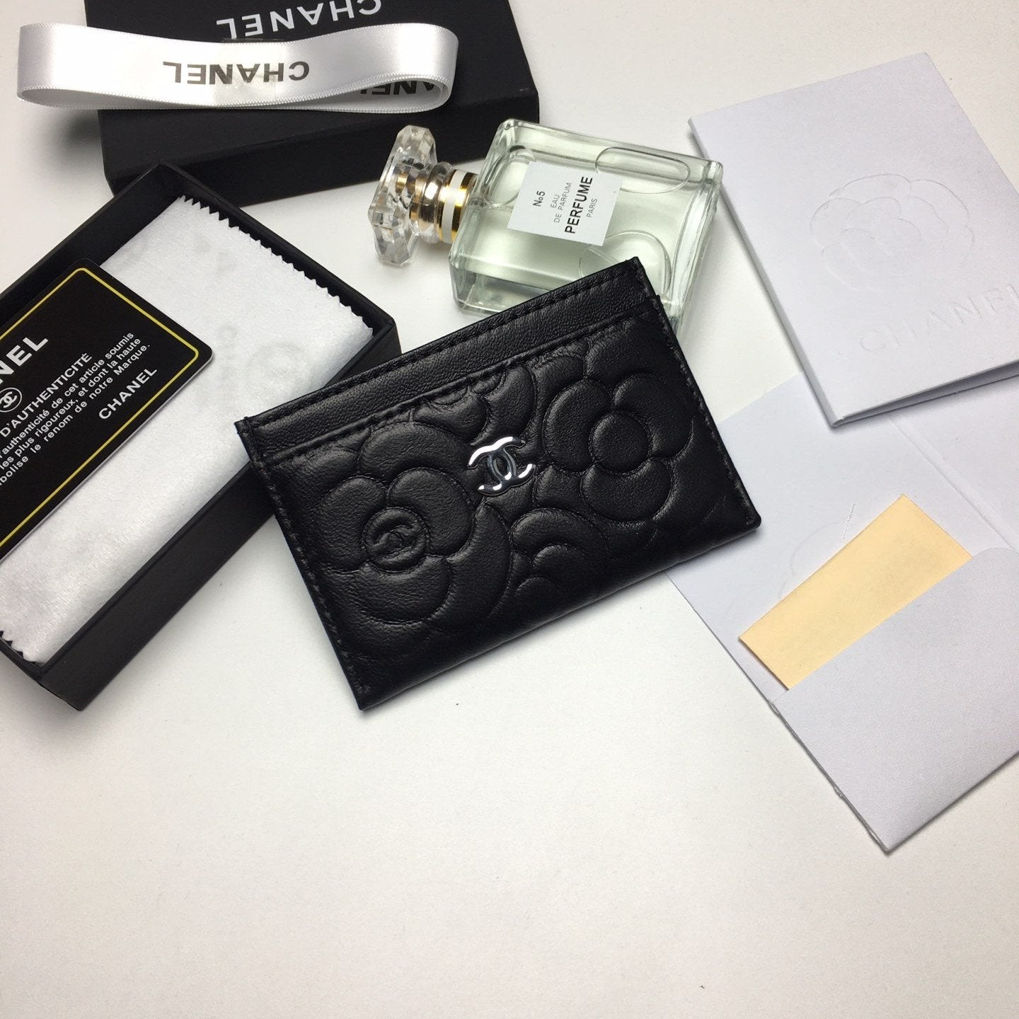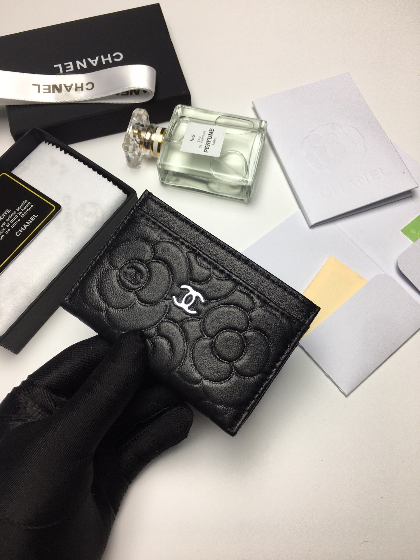 CC FLORAL CARD HOLDER 11.2 BLACK CALFSKIN SILVER ICON