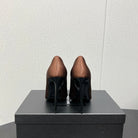 HIGH PUMPS IN TOFFEE BROWN SILK ATTACHED GOLD CHAIN