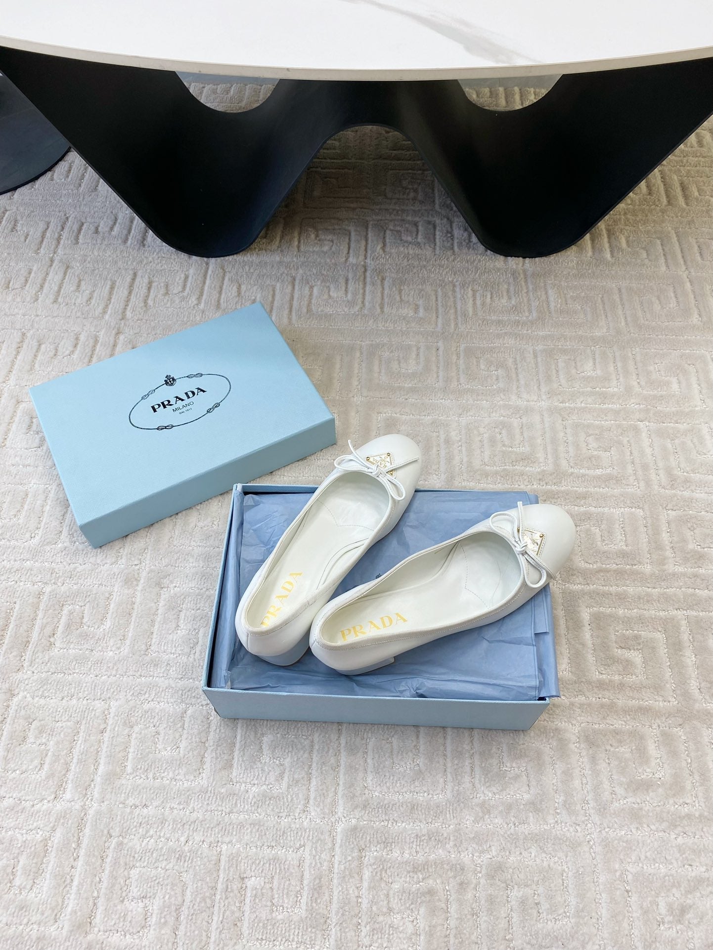 BALLERINA PUMPS WITH TRIANGLE LOGO AND BOW IN WHITE CALFSKIN