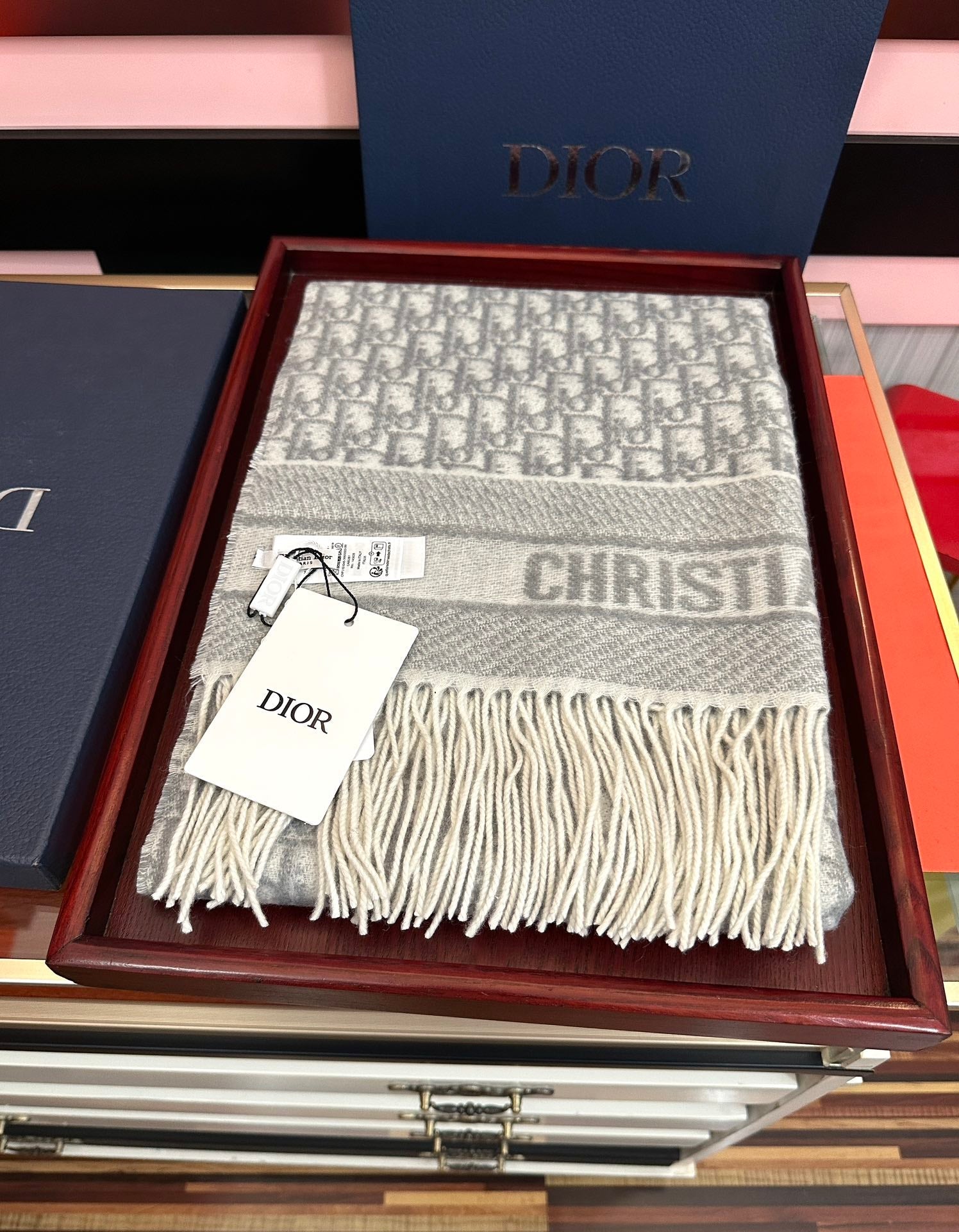 CD Oblique Print Scarf 200CM Gray White Wool 292981