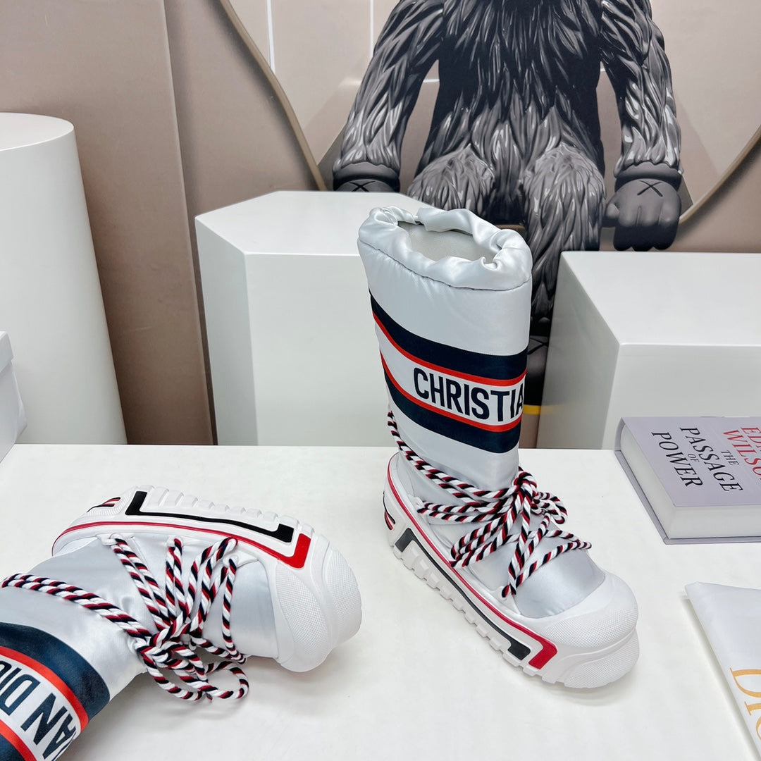 CD Platform Snow Boots White Navy Blue Cowhide Nylon Fabric 539652