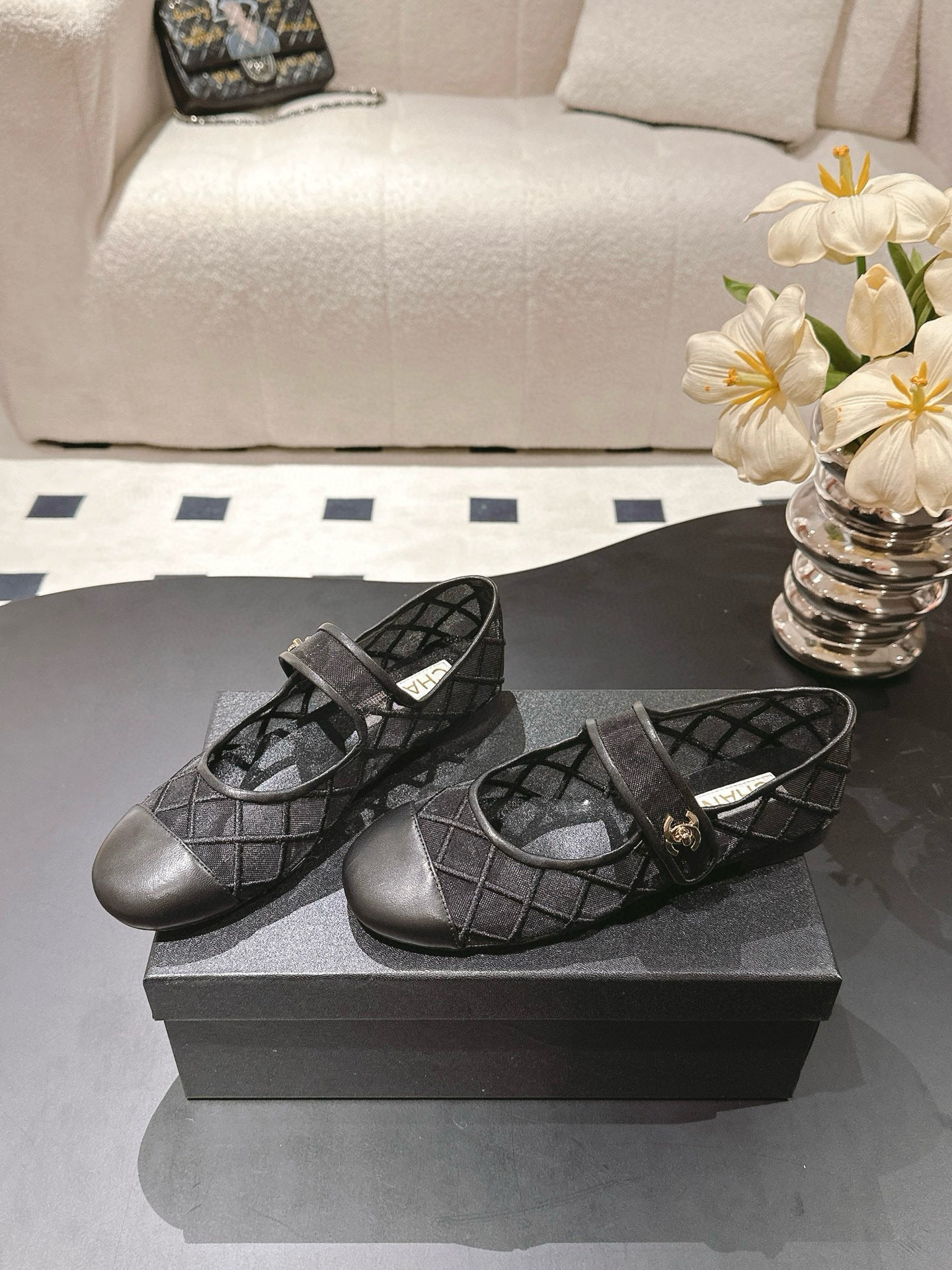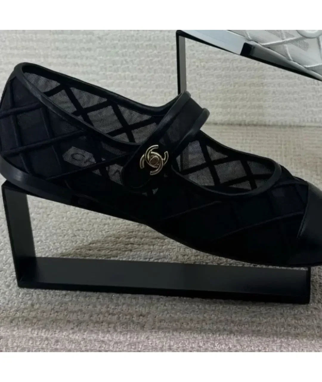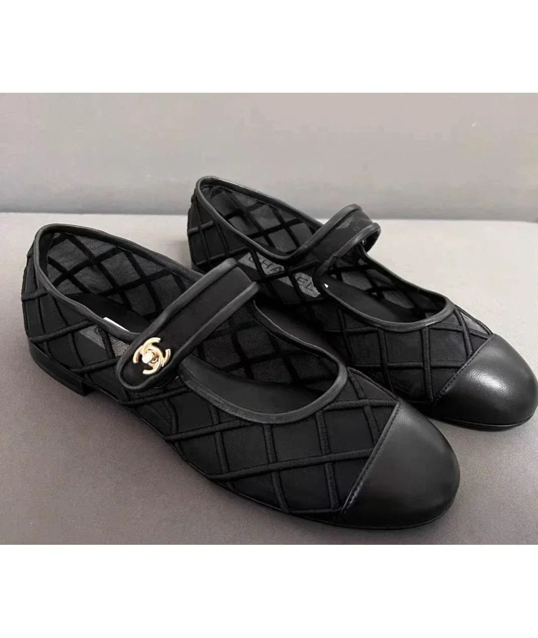 Chanel Mary Janes Flats Black Mesh Leather