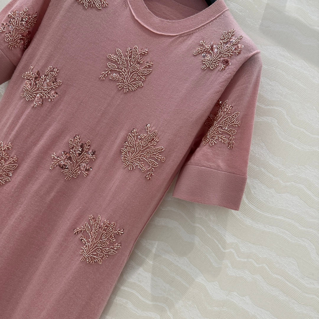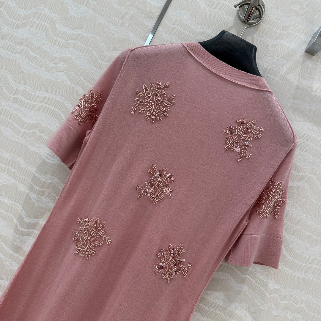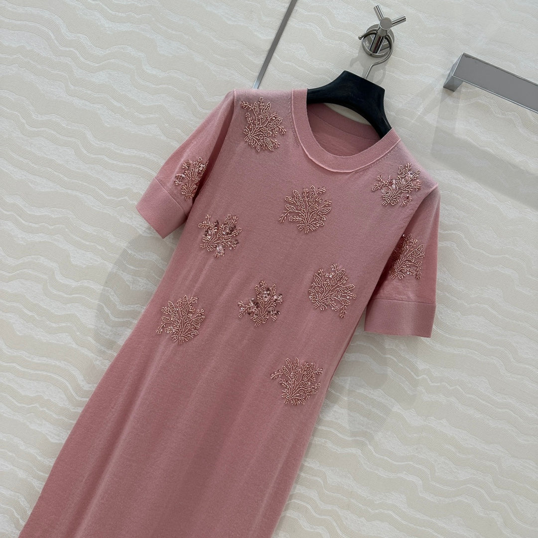 Fendi Beaded Flower Knitted Dress Pink Wool