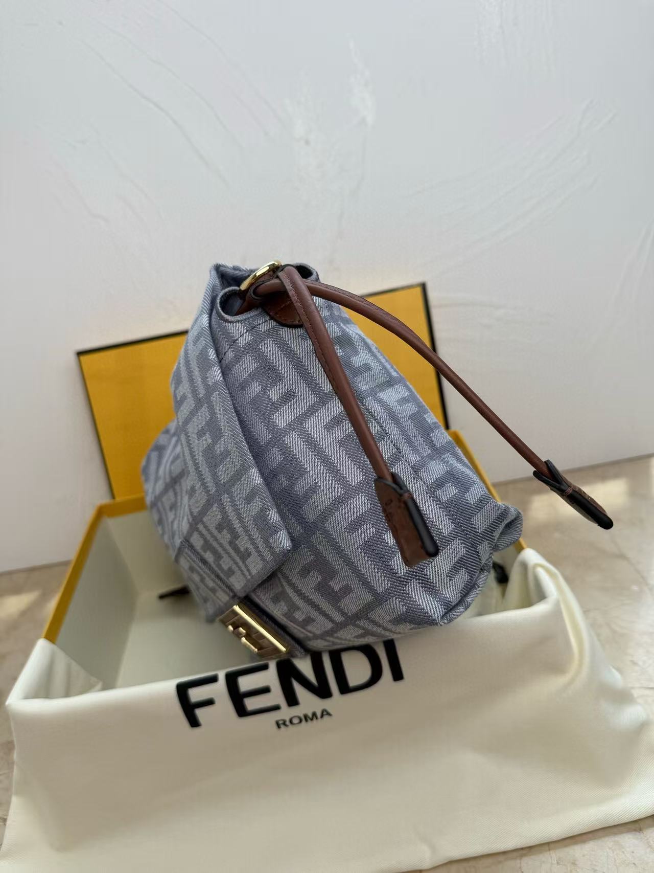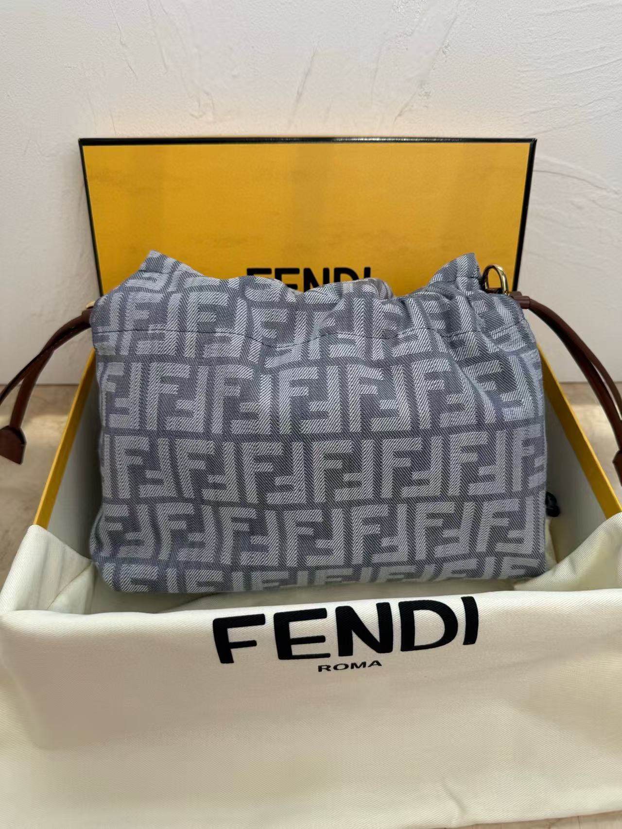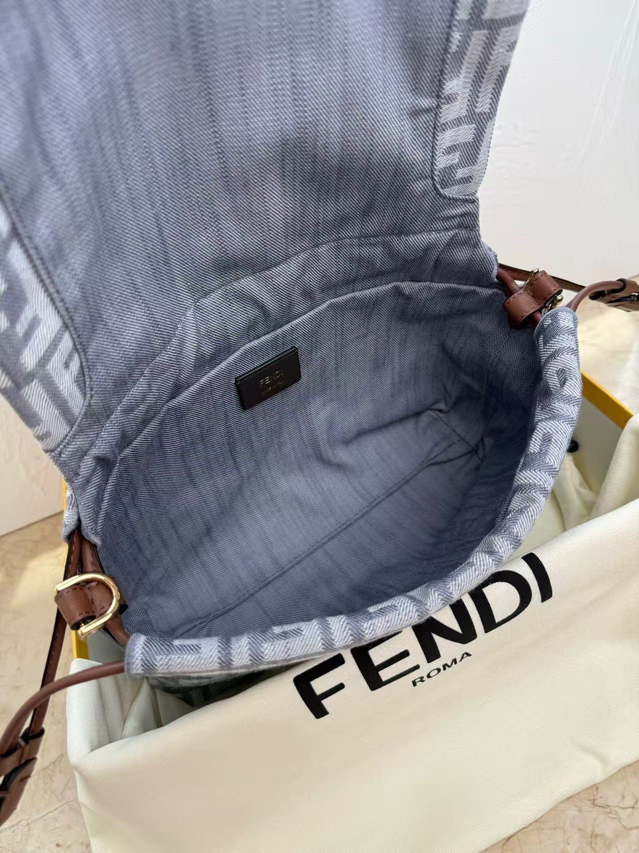 Fendi Mamma Baguette Drawstring Shoulder Bag Blue Brown Denim Fabric Leather