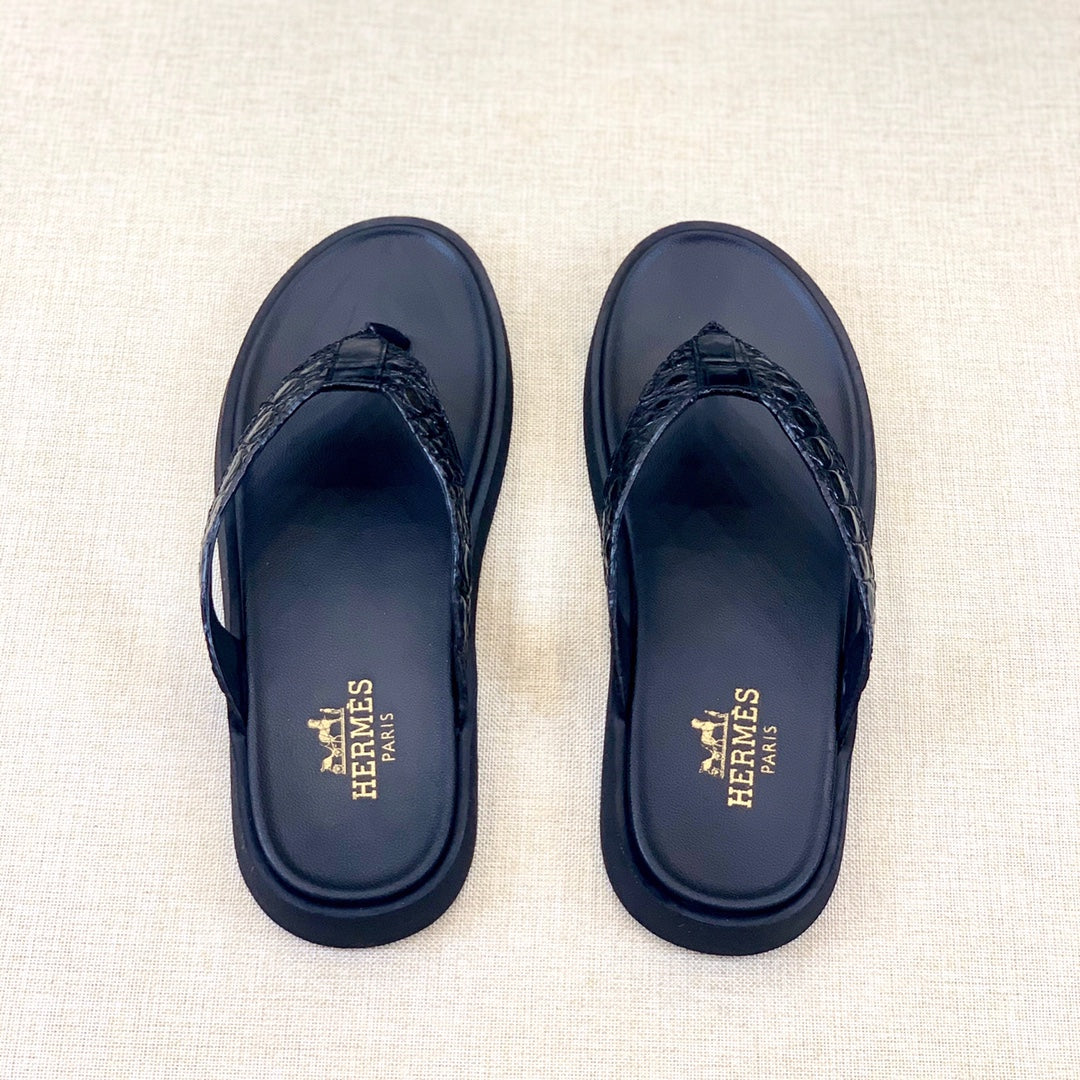HM Men's Thong Sandals Black Rubber Sheepskin 561664