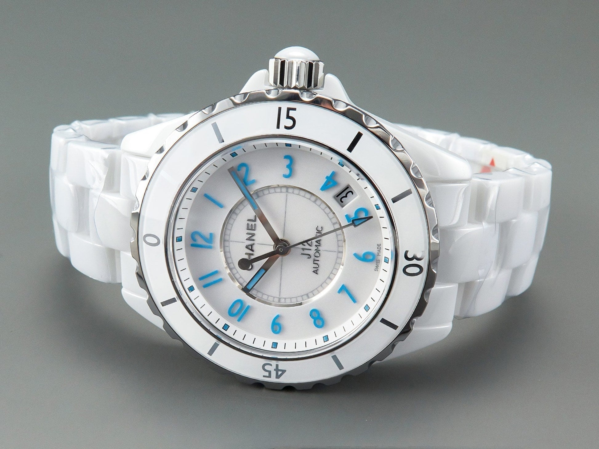 J12 Date Automatic White Ceramic Blue Numerals White Dial