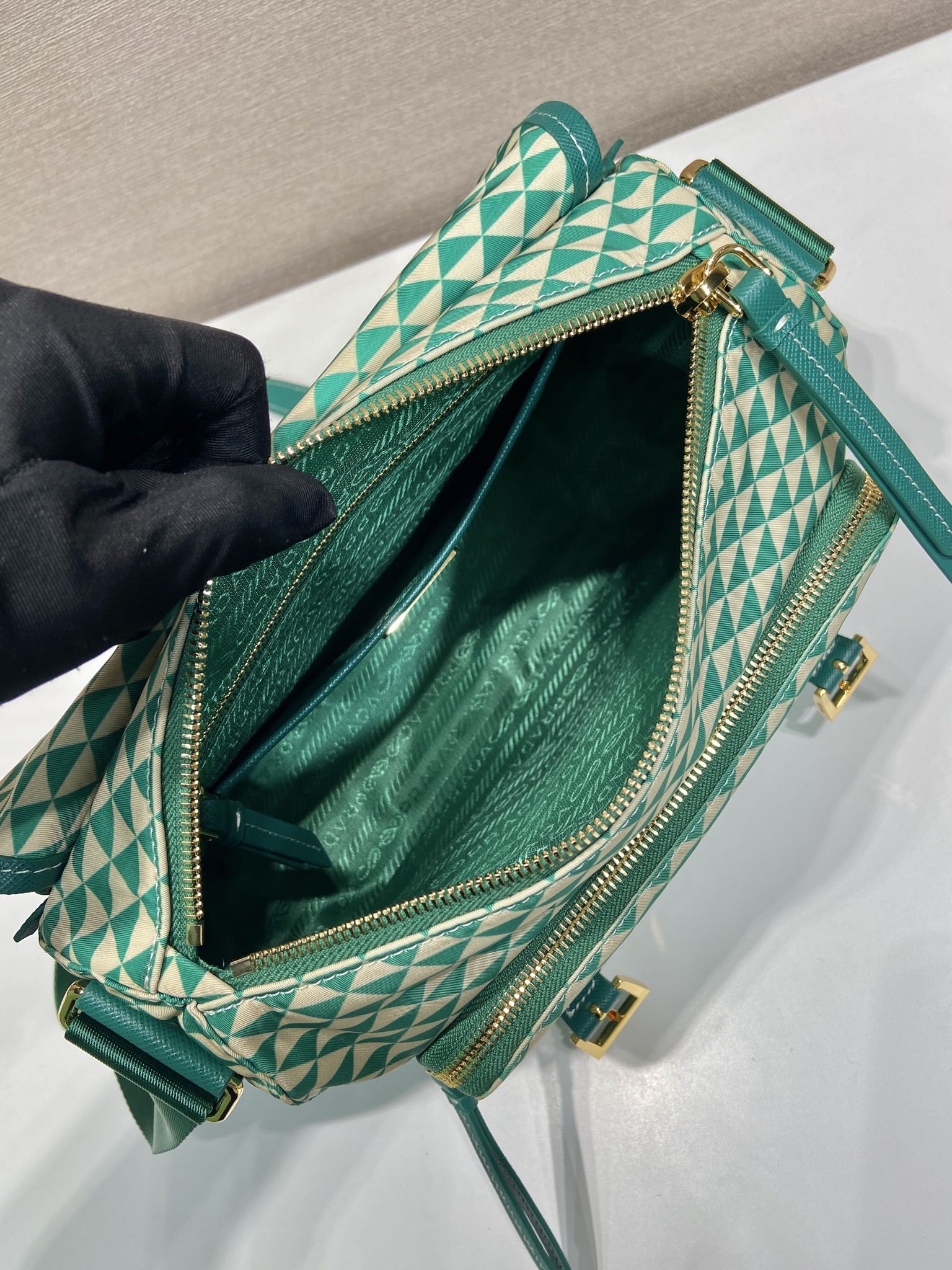 MESSENGER BAG 25 IN FOREST GREEN MIX CREAM TRIANGLE PATTERN EMBROIDERED FABRIC