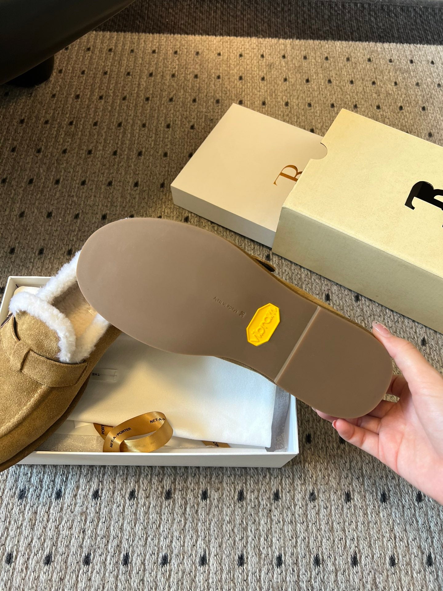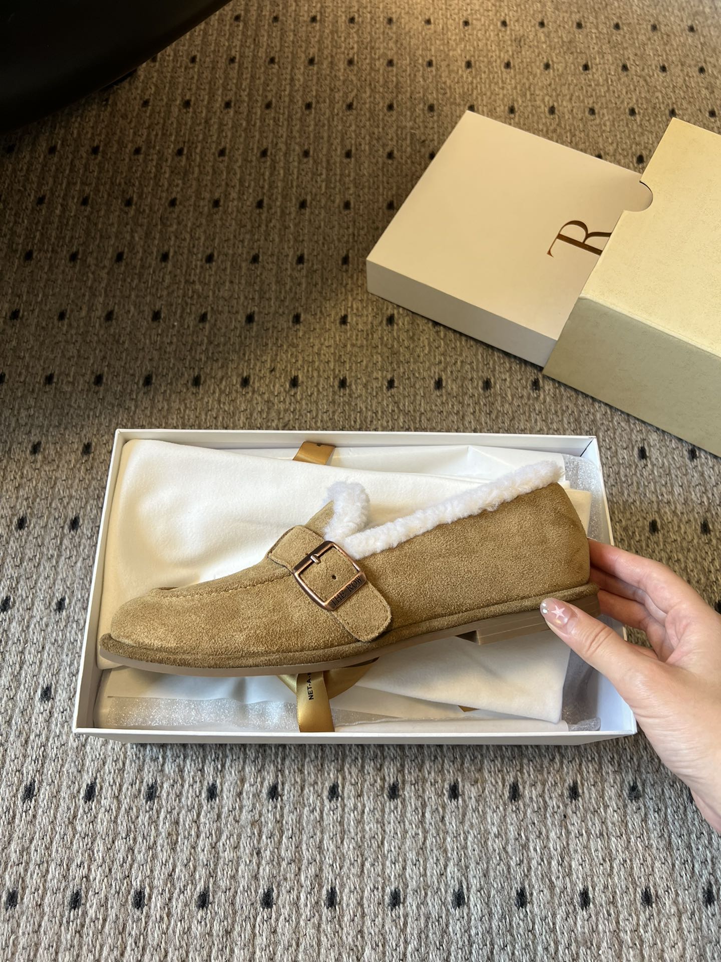 The Row 2025 Shearling Loafer Tan White Suede Wool 561603