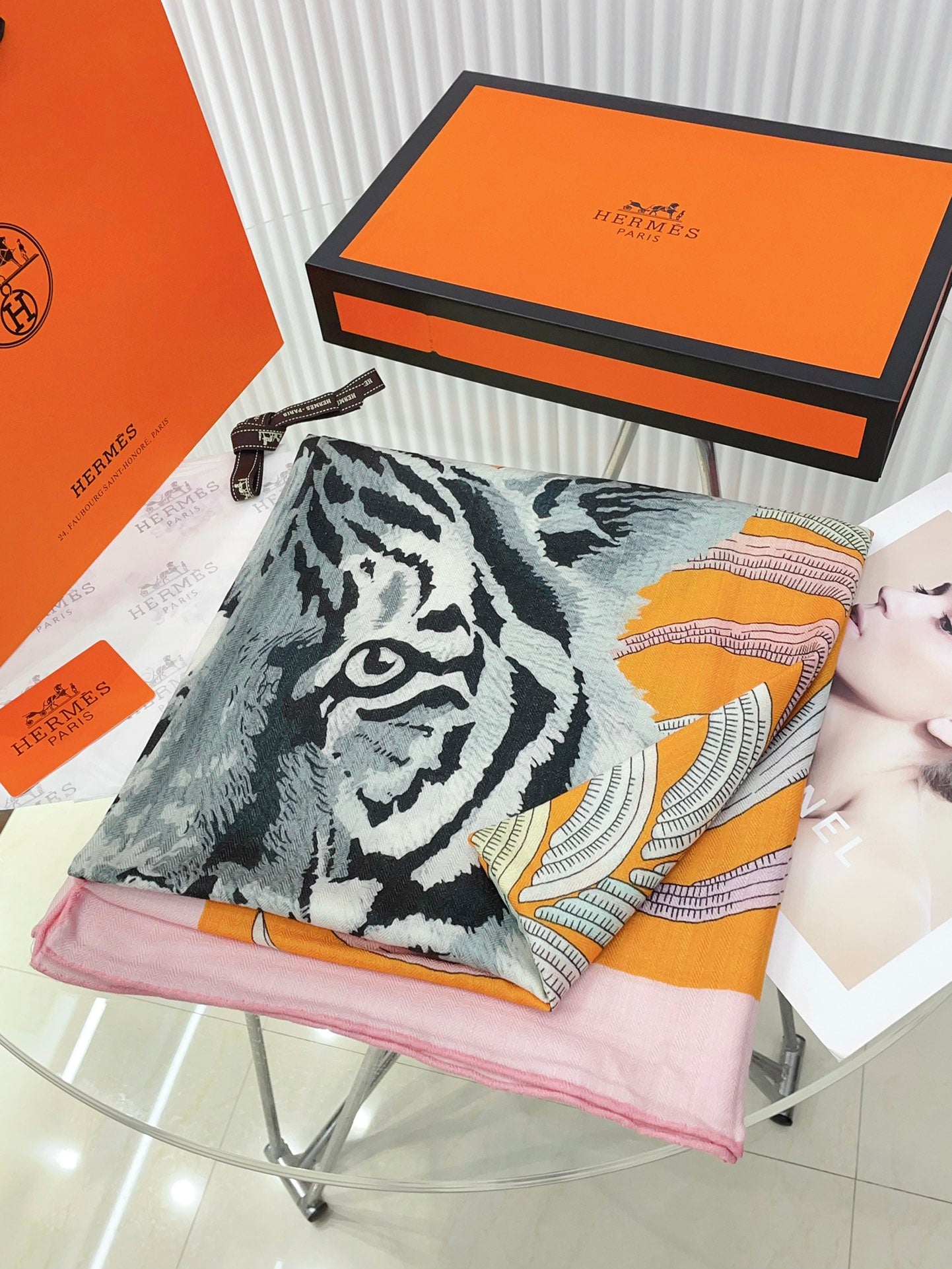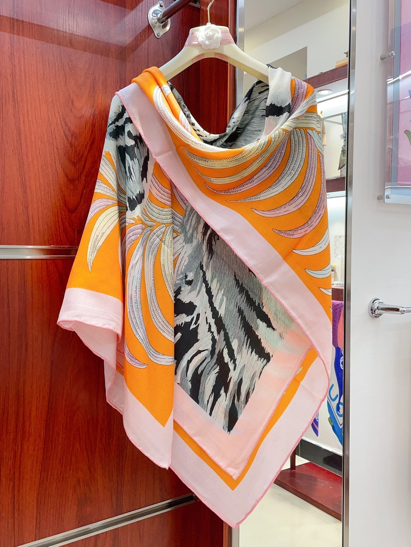 Tigre Royal Double Face Scarf 140 CM In Orange Colorful Cashmere And Silk 254646